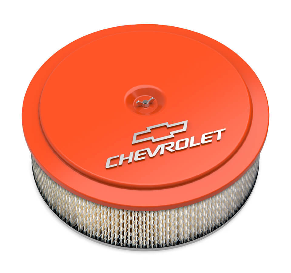 HOLLEY – 14 x 4 Air Cleaner GM Muscle Series Orange HLY120-217 Air Cleaner Assembly – GM Muscle – 14 in Round – 4 in Tall – 5-1/8 in Carb Flange – Drop Base – Raised Chevy Bowtie Logo – Paper Filter – Aluminum – Orange Powder Coat – Each