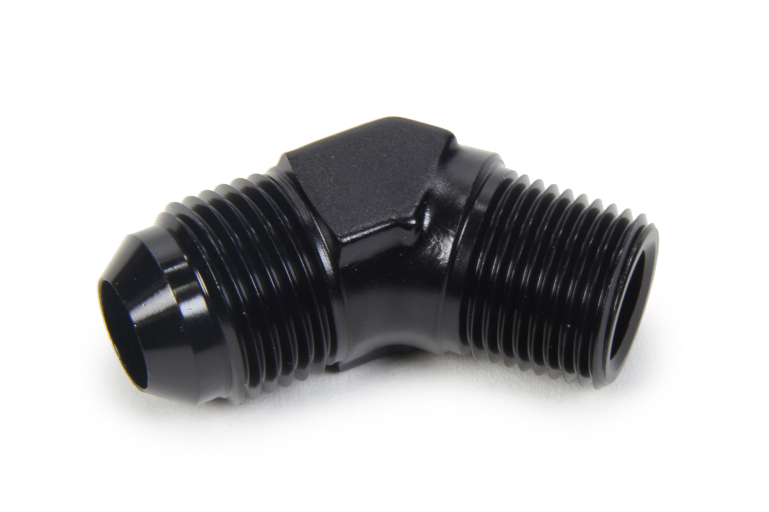 Fitting – Adapter – 45 Degree – 8 AN Male to 3/8 in NPT Male – Aluminum – Black Anodized – Each