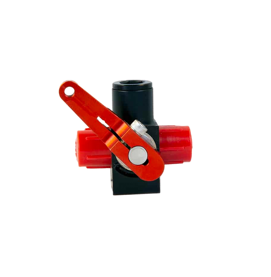 Shutoff Valve – Fuel Shutoff – Manual – Dash Mount – 6 AN Male Inlet – 6 AN Male Outlets – 6 AN Female O-Ring Return – Aluminum – Black / Red Anodized – Each
