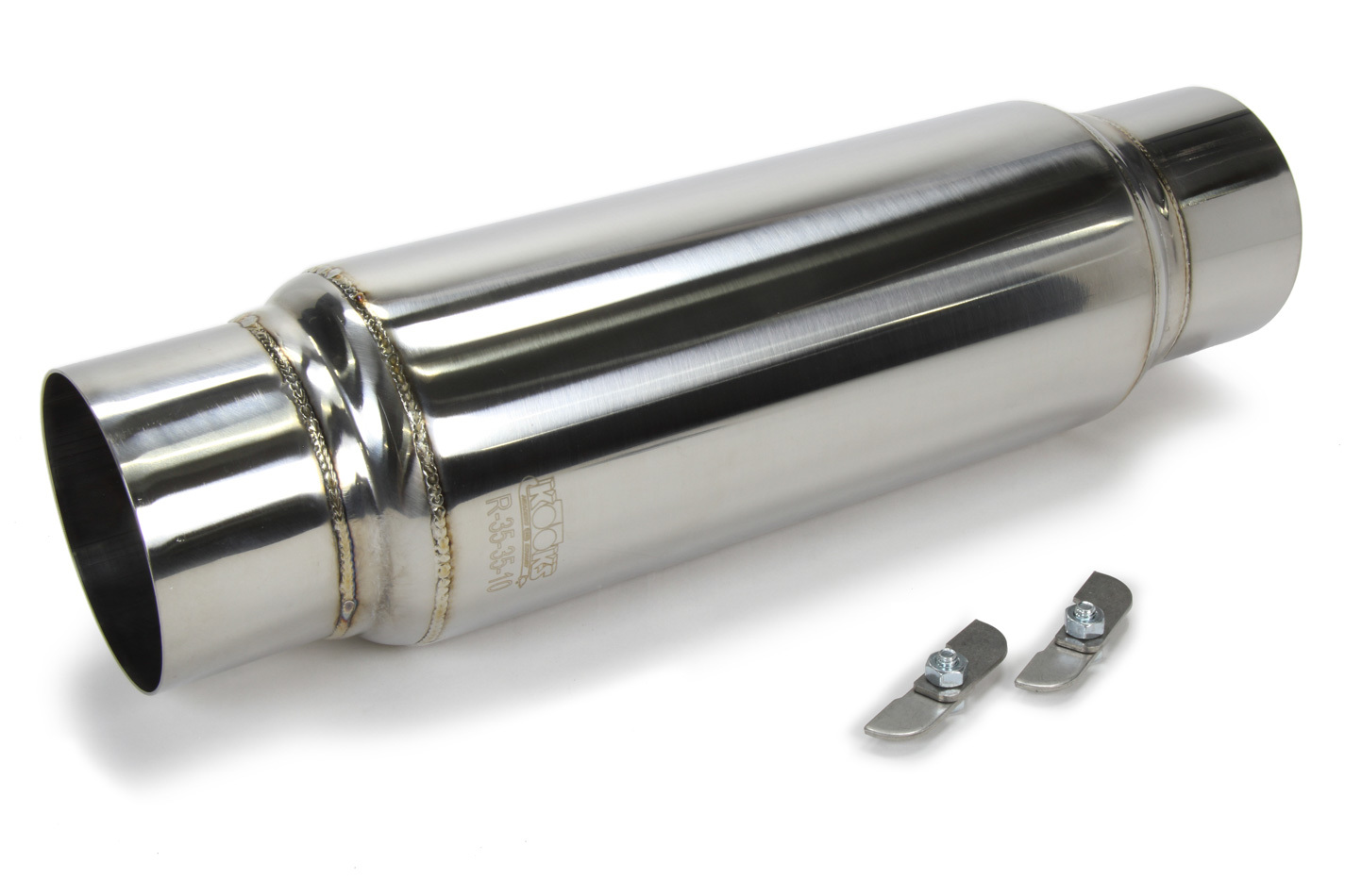 KOOKS HEADERS – Universal 3 1/2in Round Muffler 10in Long. Pol KOKR35-35-10 Muffler – Stafford Spec – 3.5 in Center Inlet – 3.5 in Center Outlet – 10 in Long – Stainless – Natural – Universal – Each